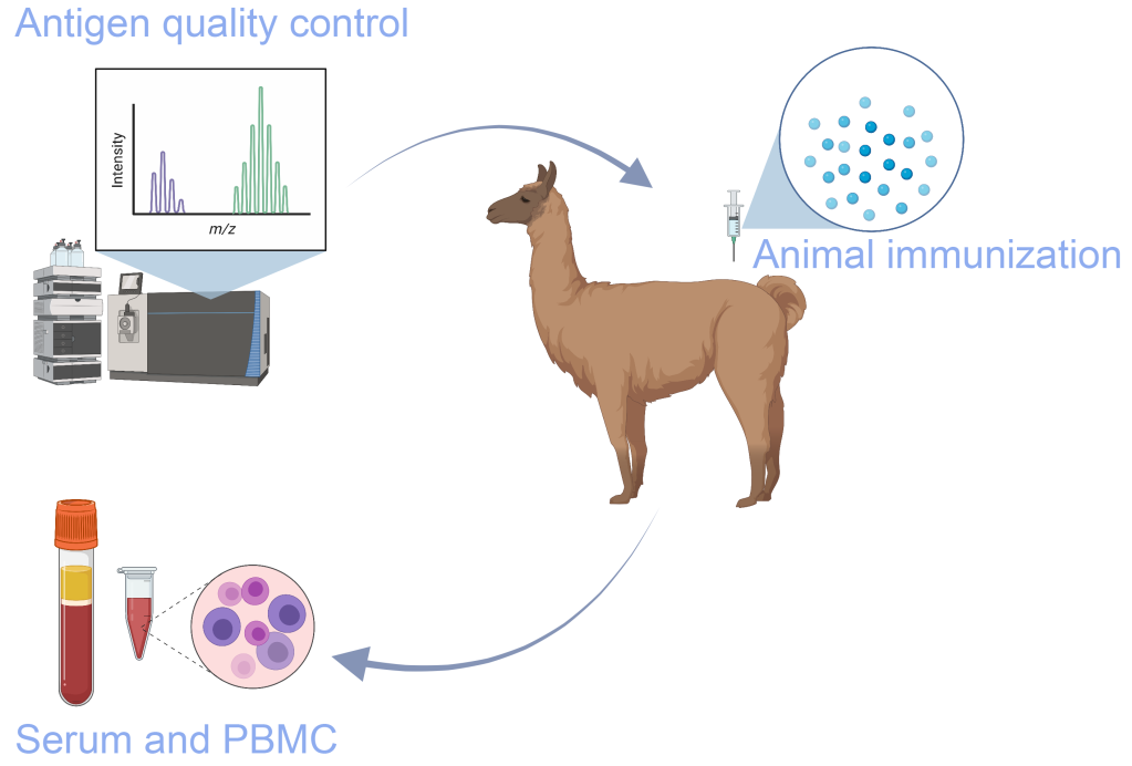 Our general workflow includes up to 4 and 7 times of immunization with the antigen of choice for camelids and shark respectively. After the last immunization, our staff collect blood samples from the immunized animals and isolate the peripheral blood mononuclear cells for further analysis. The whole immunization workflow takes 1-2 and 3- 6 months for camelids and shark respectively.